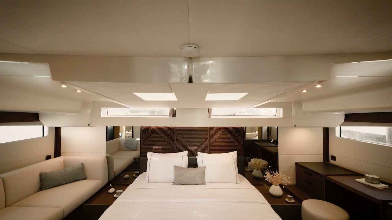 The M48 offers surprising spaciousness for a yacht in this category. The exterior saloon extends over six meters across and offers various configurations adapted for each moment of the day. The full-beam forward owner's cabin, inundated with light, features a king-sized berth, framed by a desk and a sofa. Two guest cabins offer comfortable standing headroom and views of the sea.